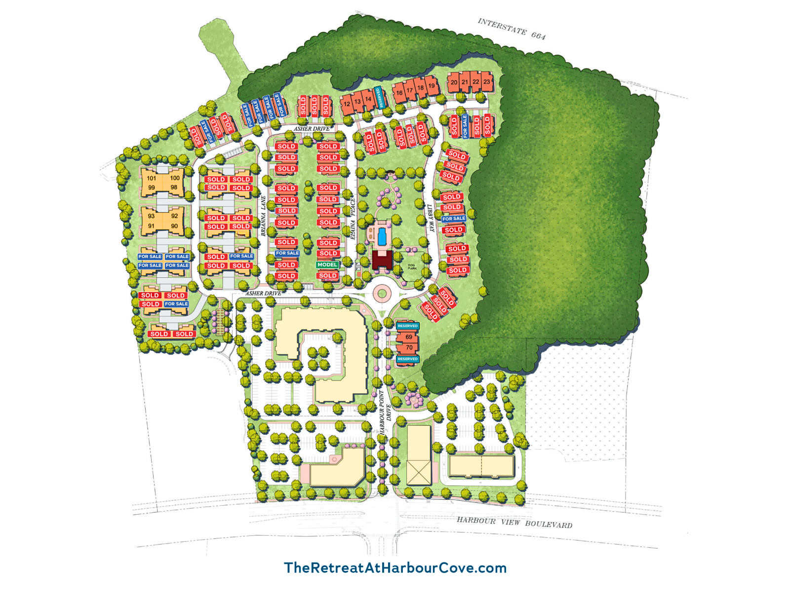 The Retreat at Harbour Cove is an upscale 55+ community in Suffolk, VA, nestled within the desirable Harbour View area. Our homeowners experience an active and community-oriented lifestyle in a vibrant and luxurious environment. With top-notch amenities and maintenance-free grounds, this community is perfect for making friends and beautiful memories. Five signature floor plans are available and come with standard first-floor primary bedrooms, 2-car garages, and exterior living spaces. You'll choose the perfect home for you and your family to enjoy for decades to come. The convenient location in the popular Harbour View area provides walkable access to shopping, dining, and entertainment!